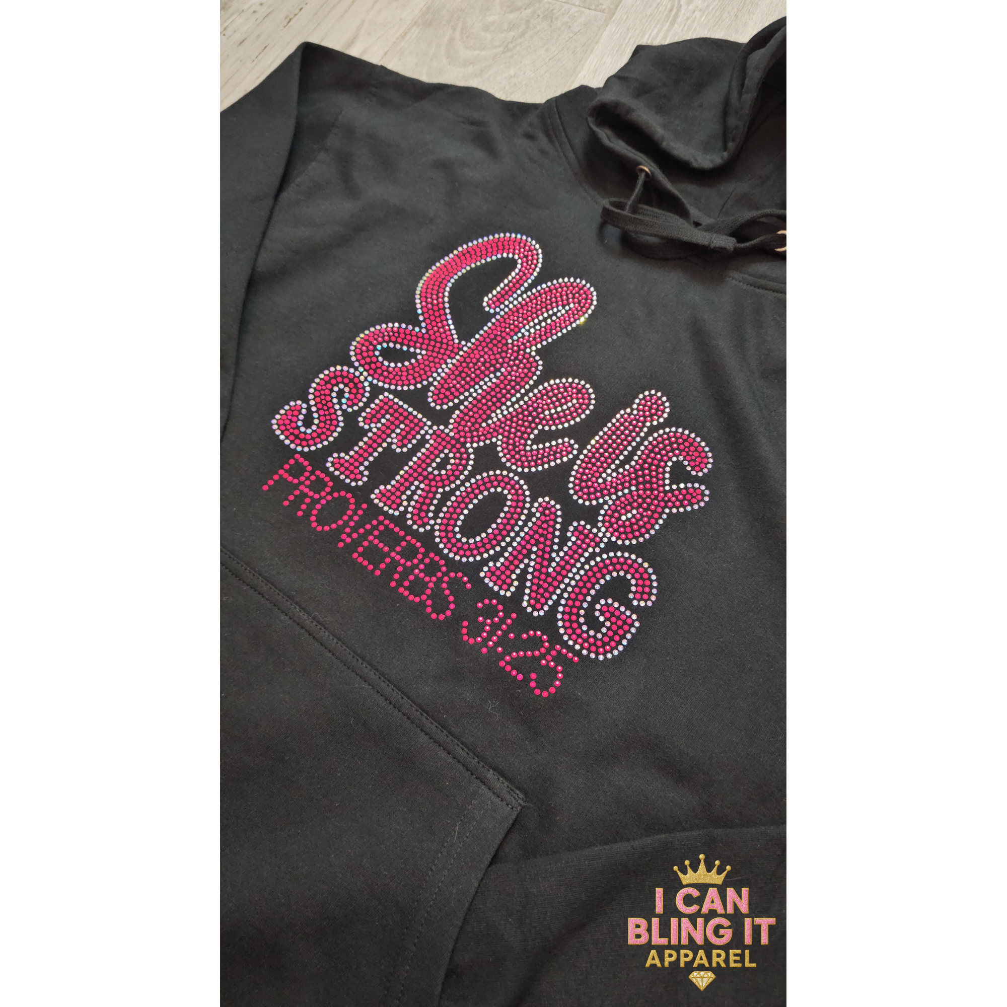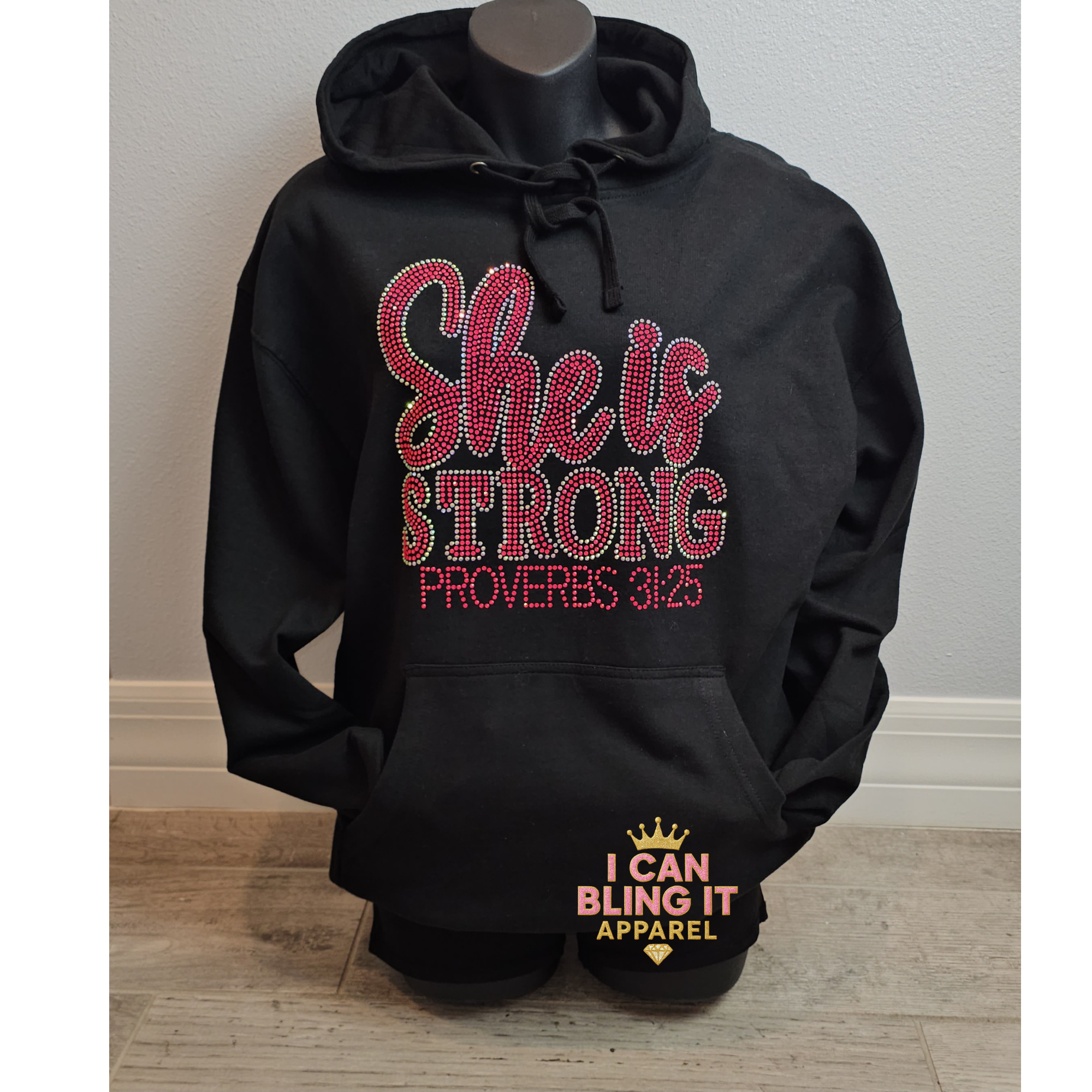 Go to the shop✨ Faith + Fashion ✨ Shine bright in strength and style with my “She is Strong – Proverbs 31:25” rhinestone hoodie 💎 A little sparkle, a lot of scripture, and a reminder that God’s word looks good on you 🙌💖 Perfect for cozy days, church vibes, or just letting your light shine! ✝️✨
